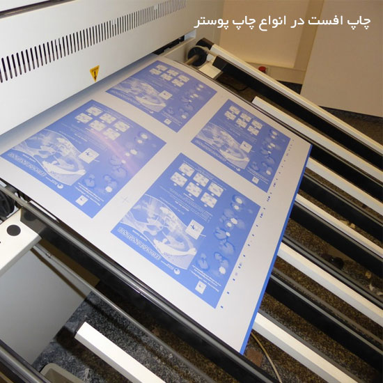 نوع دیگر از انواع چاپ پوستر تبلیغاتی ، چاپ افست می باشد که در تیراژ بالا مناسب و به صرفه برای مشتریان است . در این روش جوهر از یک صفحه فلزی به یک صفحه پلاستیکی و در انتها به کاغذ منتقل می شود لذا دقت رنگ در این روش زیاد می باشد.